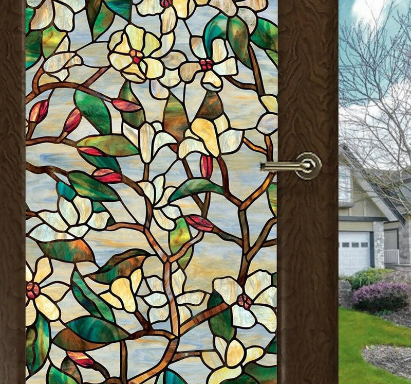 Creates visual impact of stained glass and Brighten your windows or glasses in seconds with botanical designs of magnolia Window Film from HY Wall Art.